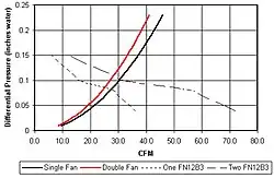 Neste exemplo específico, adicionar um segundo ventilador forneceu uma melhoria marginal com o fluxo para ambas as configurações sendo de aproximadamente 27–28 pés cúbicos por minuto (0,76–0,79 m3/min). Embora não mostrado no gráfico, um segundo ventilador em série forneceria um desempenho ligeiramente melhor do que a instalação em paralelo.[carece de fontes]