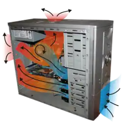 - Expulse o ar quente o mais diretamente possível. Exemplos são: Fontes de alimentação convencionais para PC (ATX) sopram o ar quente pela parte de trás do gabinete. Muitos designs de placas gráficas de slot duplo sopram o ar quente através da tampa do slot adjacente. Existem também alguns coolers de reposição que fazem isso. Alguns projetos de resfriamento da CPU sopram o ar quente diretamente para a parte de trás do gabinete, onde pode ser ejetado por um ventilador do gabinete.