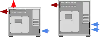 - Prefira o ar frio de admissão, evite inalar o ar de exaustão (ar externo acima ou próximo aos exaustores). Por exemplo, um duto de ar de resfriamento da CPU na parte traseira de um gabinete de torre inalaria o ar quente de uma exaustão da placa gráfica. Mover todos os escapamentos para um lado do gabinete, convencionalmente na parte traseira/superior, ajuda a manter o ar de admissão resfriado.
