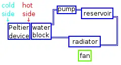 O princípio usado em um típico sistema de refrigeração líquida (ativo) para computadores é idêntico ao usado em um motor de combustão interna de um automóvel, com a água sendo circulada por uma bomba d'água através de um bloco de água montado na CPU (e às vezes componentes adicionais como GPU e ponte norte)[23] sai para um trocador de calor, normalmente um radiador. O próprio radiador geralmente é resfriado adicionalmente por meio de um ventilador.[23] Além de um ventilador, ele também pode ser resfriado por outros meios, como um resfriador Peltier (embora os elementos Peltier sejam mais comumente colocados diretamente em cima do hardware a ser resfriado e o refrigerante seja usado para conduzir o calor para longe do calor lado do elemento Peltier).[24][25] Muitas vezes, um reservatório de refrigerante também é conectado ao sistema.[26]