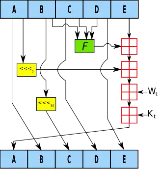 Uma iteração dentro da função de compressão do SHA-1: A, B, C ,D e E são palavras de 32 bits do estado; F é uma função não-linear que varia; denota a rotação de bits à esquerda em n espaços; n varia para cada operação; Wt é a palavra da mensagem expandida da rodada t; Kt é a constante da rodada t; denota uma adição módulo 232.