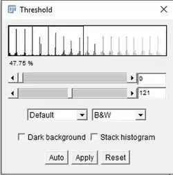 Com a utilização do método com um valor de constante de intensidade de 121, obtém-se a imagem a seguir, e abaixo dela está o histograma obtido pelo Software Fiji.