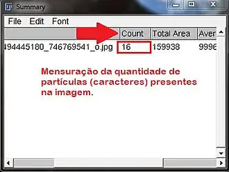 Uma outra aplicabilidade da segmentação é facilitar e tornar possível a mensuração da quantidade de partículas específicas presentes em determinada imagem. Como exemplo, podemos utilizar a seguinte imagem na qual se deseja contabilizar apenas os caracteres do título “Sistemas Digitais” (Figura 1). Primeiramente a imagem é transformada para 8 bits onde apresentará apenas diferentes tons de cinza. Após isso, é ajustada a ferramenta “Threshold” (Software FIJI) de forma que se enxergue somente as palavras que se pretende efetuar a contagem, palavras essas que possuem coloração mais marcante (Figura 2). A partir da imagem segmentada (Figura 2) é possível contabilizar a quantidade de partículas, que nesse caso são caracteres, presentes na imagem através da ferramenta “Analize Particles“ (Software FIJI) (Figura 3). Podemos, com base nesse modelo, expandir para áreas com aplicabilidade funcional como no ramo da Biologia podendo-se fazer estimativa da quantidade de células de uma determinada estrutura.