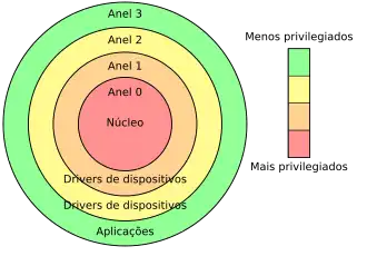 Muitas arquiteturas modernas de CPU (incluindo a popular arquitetura Intel x86) incluem alguma forma de proteção em camada, embora o sistema operacional Windows NT, como o Unix, não utilize totalmente esse recurso. O OS/2 o fez até certo ponto, usando três camadas: camada 0 para o código do núcleo e drivers de dispositivo, camada 2 para código privilegiado (programas de usuário com permissões de acesso de E/S) e camada 3 para código não privilegiado (quase todos os programas de usuário). No DOS, o núcleo, os drivers e os aplicativos normalmente são executados na camada 3 (no entanto, isso é exclusivo para o caso em que drivers de modo protegido e/ou extensores DOS são usados; como um sistema operacional de modo real, o sistema funciona efetivamente sem proteção), enquanto gerenciadores de memória 386, como o EMM386, são executados na camada 0.