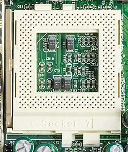 Soquete 7 foi um dos tipos de soquete mais usado para processadores da classe Pentium de antigamente. Ele possui 321 pinos e pode fornecer tensões que variam de 2,5 a 3,3 volts. Aceita todos os processadores Pentium de 66 MHz para cima (sendo do mesmo tipo de soquete), o Pentium MMX, além dos processadores AMD, tais como: K5, K6, K6-2, K6-III, K6-2+, K6-III+, 6x86, 6X86MX, MII, etc. Aceita também os processadores Pentium “overdrive”. A Intel abandonou este soquete com o lançamento do Slot 1, mas outros fabricantes o utilizaram até o ano de 2001. O Socket 7 pode trabalhar com voltagens ainda menores que 3,33 e 2,5 volts se a placa-mãe possuir um regulador de tensão para isto.