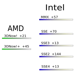 - SSE3 chamado de Prescott New Instructions, é um upgrade incremental ao SSE2, adicionando instruções matemáticas orientadas à DSP (DSP-oriented) e algumas instruções de manipulação de processos (thread).