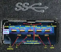 Os pinos VBUS, D−, D+ e GND são necessários para a comunicação USB 2.0. Os pinos USB 3.0 adicionais são dois pares diferenciais e um terra (GND_DRAIN). Os dois pares diferenciais adicionais são para transferência de dados SuperSpeed; eles são usados para sinalização SuperSpeed full duplex. O pino GND_DRAIN é para terminação do fio dreno e para controlar EMI e manter a integridade do sinal.