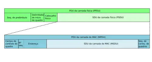 A unidade de dados de protocolo (U.D.P., P.D.U.) da camada de controle de acesso ao meio (C.A.M., M.A.C.) se torna uma unidade de dados de serviço (U.D.S., S.D.U.) da camada física.