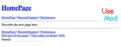 - ↑ «UseMod: UseModWiki». UseModWiki (em inglês). 17 de outubro de 2000. Consultado em 6 de novembro de 2021. Cópia arquivada em 17 de outubro de 2000