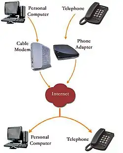 Entretanto, apesar de amplamente utilizado através de computadores, o VoIP pode ser utilizado através de adaptadores para telefones analógicos ou gateways VoIP, que são aparelhos que podem ser conectados diretamente em uma conexão banda larga e a um aparelho telefônico comum ou a um PABX em posições de troncos ou ramais. Eles fornecem a interligação entre as redes IP e fixas.