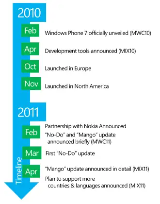 Em fevereiro de 2011, na Mobile World Congress, Steve Ballmer anunciou uma grande atualização do Windows Phone 7 a ser lançada no final do ano[24] e revelou novas funcionalidades da plataforma, entre elas, uma versão móvel do Internet Explorer 9 que suporta os mesmos standards web e capacidades gráficas que a versão de computador,[25] integração do Twitter no centro 'Contactos',[26][27] multitarefas para aplicações de terceiros[28] e acesso ao Windows Live SkyDrive.[29]