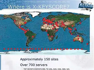 O sistema funciona em uma infraestrutura com cerca de 500 servidores espalhados pelo mundo. Os servidores foram instalados em diversos países sem conhecimento dos mesmos, inclusive no Brasil. conforme é mostrado em uma apresentação da NSA exposta por Snowden. De acordo com as revelações, em janeiro de 2013 apenas, a NSA tinha recolhido 2,3 bilhões de dados de usuários brasileiros.[14] Comentando sobre o programa, o Jornal The Guardian, que teve acesso aos documentos do programa afirmou que: "a quantidade de comunicações a que a NSA tem acesso por meio de programas como o XKeyscore é assustadoramente grande".