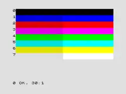 O modo de texto do Spectrum era constituído por 24 linhas de 32 caracteres, que equivalia a uma resolução gráfica de 256 pixéis na horizontal e por 192 pixéis na vertical. O Spectrum podia produzir 15 cores, 8 cores de base, numeradas de 0 a 7. Preto (0), Azul (1), Vermelho (2), Magenta (3), Verde (4), Azul Ciano (5), Amarelo (6) e Branco (7).