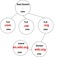 O espaço de nomes de domínio da Internet é organizado em um leiaute hierárquico de subdomínios abaixo do domínio raiz do DNS. Os domínios individuais desta árvore podem servir como pontos de delegação para autoridade administrativa e gerenciamento. No entanto, geralmente é, além disso, desejável implementar limites refinados de delegação, de modo que vários subníveis de um domínio possam ser gerenciados de forma independente. Portanto, o espaço de nomes de domínio é dividido em áreas (zonas) para esse propósito. Uma zona começa em um domínio e se estende para baixo na árvore até os nós folha ou até o nível superior dos subdomínios onde outras zonas começam.[1]