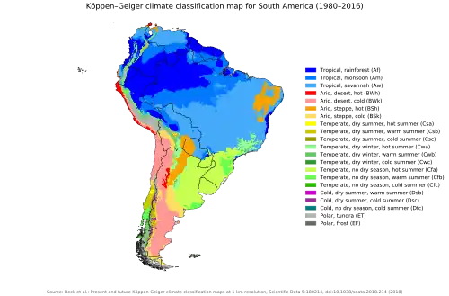 Mapa climático da América do Sul de acordo com a classificação climática de Köppen-Geiger.