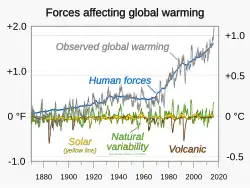 Já em 2001, o Terceiro Relatório de Avaliação do IPCC concluiu que "a alteração combinada na força radiativa dos dois principais factores naturais (variação solar e aerossóis vulcânicos) é estimada como sendo negativa nas últimas duas, e possivelmente nas últimas quatro, décadas".[89] A irradiação solar tem sido medida directamente por satélites,[90] e as medições indirectas estão disponíveis desde o início do século XVII em diante.[51] No entanto, desde 1880, não houve uma tendência ascendente na quantidade de energia do Sol que chega à Terra, em contraste com o aquecimento da baixa atmosfera (a troposfera).[91] Da mesma forma, a actividade vulcânica tem o maior impacto natural (forçante) na temperatura, mas é equivalente a menos de 1% das actuais emissões de CO2 causadas pelo homem.[92] A actividade vulcânica como um todo teve impactos insignificantes nas tendências da temperatura global desde a Revolução Industrial.[93]