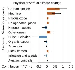 O metano e, em menor grau, o óxido nitroso também são grandes contribuintes para o efeito estufa. O Protocolo de Quioto lista-os juntamente com os hidrofluorocarbonetos (HFC), os perfluorocarbonetos (PFC) e o hexafluoreto de enxofre (SF6)[38] que são gases inteiramente artificiais, como contribuintes para o forçamento radiativo. O gráfico à direita atribui as emissões antropogénicas de gases com efeito de estufa a oito sectores económicos principais, dos quais os maiores contribuintes são as centrais eléctricas (muitas das quais queimam carvão ou outros combustíveis fósseis), os processos industriais, os combustíveis para transportes (geralmente combustíveis fósseis) e os subprodutos agrícolas (principalmente o metano da fermentação entérica e o óxido nitroso da utilização de fertilizantes).[39]
