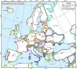 Contudo, existem mais de uma dúzia de pontos considerados como "centro geográfico da Europa", nos territórios da Lituânia, Polónia, Áustria, Alemanha, Eslovénia, República Checa, Eslováquia, Roménia, Ucrânia e Bielorrússia.