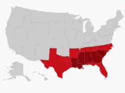 - Grande parte do "Cotton Belt" original, que se estende da Carolina do Norte e Carolina do Sul até aos estados com costa no golfo do México, incluindo assim o Texas Oriental, partes do Tennessee e Arkansas.[3]
