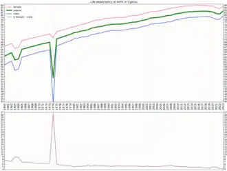 Os dados nas subseções de pirâmide etária até taxas de divórcio são apenas para a área controlada pelo governo da República do Chipre. As estimativas são para 2007 do Resumo Estatístico da República do Chipre de 2007 (pp. 63-88),[35] salvo indicação em contrário.