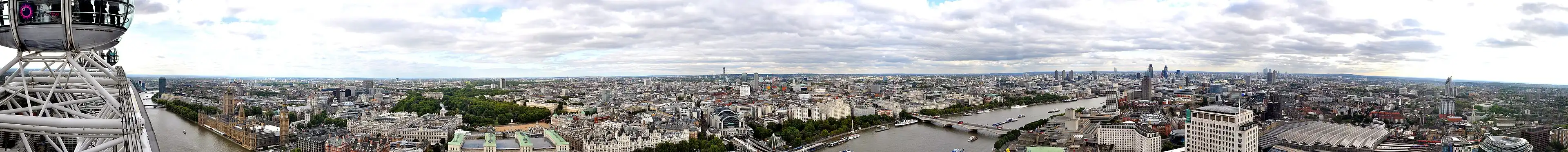 A expansão da cidade agora é impedida pelo Cinturão Verde Metropolitano,[69] embora a área urbana se estenda além desse limite em alguns lugares, o que faz com que a área urbana da Grande Londres seja definida separadamente. Além disso, há a vasta Área Metropolitana de Londres.[70] A Grande Londres é dividida para alguns propósitos entre Londres interior e exterior.[71] A cidade é dividida pelo rio Tâmisa de norte a sul. As coordenadas do centro original de Londres, tradicionalmente considerado entre as Cruzes de Eleanor, a Charing Cross, próxima a junção da Trafalgar Square e de Whitehall, são 🌍.[72]