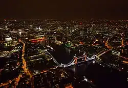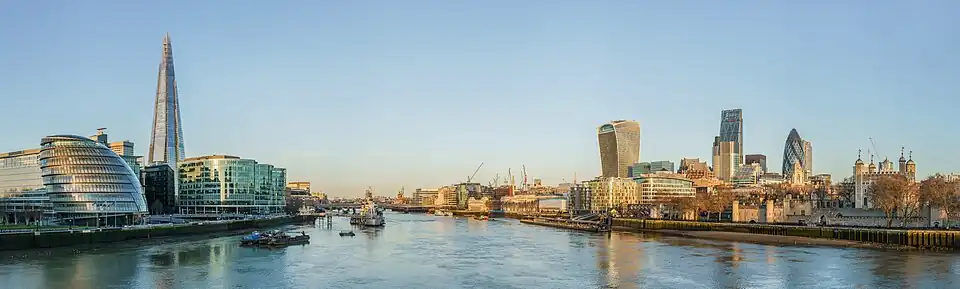 Tâmisa e a Ponte da Torre com o The Shard (esquerda), a Torre de Londres e a Cidade de Londres (direita) London Eye Coluna de Nelson Catedral de São Paulo Piccadilly Circus Canary Wharf Palácio de Westminster e o Big Ben |