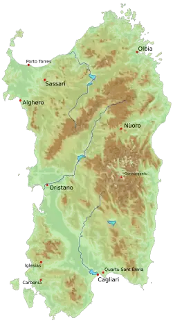 As áreas montanhosas e planaltos estão separados por extensos vales aluviais e planícies, sendo as mais importantes as de Nurra, a noroeste, e de Campidano, a mais extensa, no sudoeste, entre Oristano e Cagliari.[nt 2]