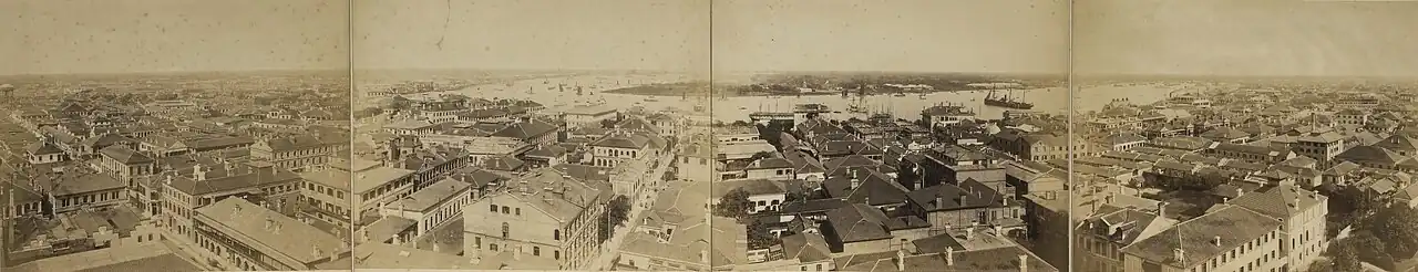 A Cidade Velha de Xangai, controlada pelos chineses, caiu para os rebeldes da Sociedade das Espadas Pequenas em 1853, mas foi recuperada pelo governo Qing em fevereiro de 1855.[21] Em 1854, o Conselho Municipal de Xangai foi criado para administrar os assentamentos estrangeiros. Entre 1860 e 1862, os rebeldes Taiping atacaram duas vezes Xangai e destruíram os subúrbios leste e sul, mas não conseguiram tomar o centro da cidade.[22] Em 1863, o assentamento britânico ao sul do rio Suzhou (norte do distrito de Huangpu) e o assentamento estadunidense ao norte (sul do distrito de Hongkou) se juntaram para formar o Assentamento Internacional de Xangai. Os franceses optaram por não participar do Conselho Municipal de Xangai e mantiveram sua própria concessão ao sul e sudoeste.[23]