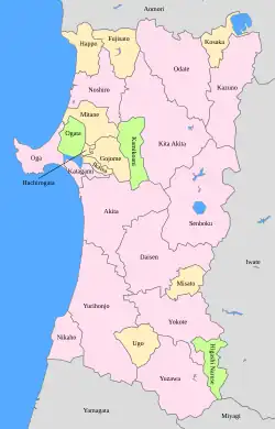 Ela mudou de mãos algumas vezes. Durante o Shogunato Tokugawa, foi apropriada pelo clã Satake, que dominou a região por 260 anos, durante o período Edo desenvolvendo a agricultura e a indústria de mineração que ainda são predominantes hoje. Durante esse período, foi considerada como uma parte da província de Dewa.[4] Em 1871, durante a Restauração Meiji, a província de Dewa foi reformulada, passando de um domínio Han para a prefeitura que permanece até hoje.→