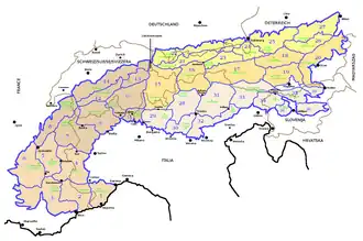 A chamada divisão tradicional divide os Alpes em Alpes Ocidentais, Alpes Centrais e Alpes Orientais, segundo a Partição dos Alpes adotada em 1926 pelo Congresso Geográfico Italiano.