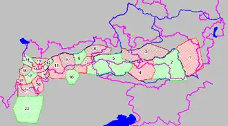 Divisão tradicional dos Alpes Orientais Centrais (as linhas a roxo são as fronteiras internacionais e as dos estados da Áustria)