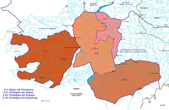 Na divisão tradicional corresponde à reunião dos Alpes da Provença e aos Pré-Alpes da Provença.