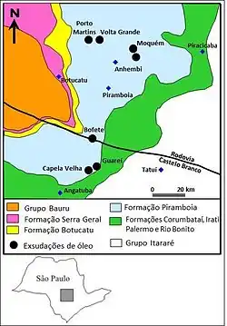- ↑ Marchi; et al. «Arenitos asfálticos na Bacia do Paraná: estudo das ocorrências no Alto Estrutural de Anhembi» (PDF). Arenitos asfálticos na Bacia do Paraná: estudo das ocorrências no Alto Estrutural de Anhembi. Consultado em 13 de fevereiro de 2019