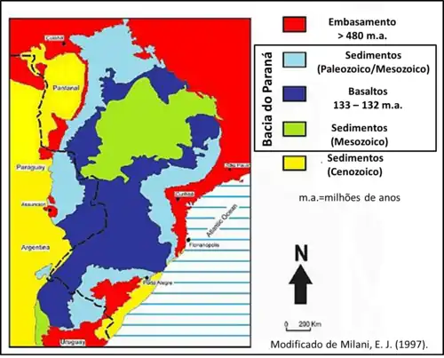 - 1 2 3 4 5 6 7 8 9 10 11 12 13 14 Milani, E.J. Comentários sobre a origem e a evolução tectônica da Bacia do Paraná. In: Mantesso Neto, V.; Bartorelli, A.; Carneiro, C.D.R.; Neves, B.B.B. (Eds.). Geologia do continente sul-americano - evolução da obra de Fernando Flávio Marques de Almeida. São Paulo, Brasil: Beca, 2005. p.264-279.