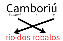 Há duas versões quanto à origem do topônimo Camboriú. Uma de origem popular, devido a uma acentuada curva do rio perto da foz, diz que, quando indagados por alguém à procura de uma pessoa, os moradores dali diziam: "camba o rio", vocábulo muito usado pelos pescadores da região. A segunda versão (e mais aceitável) é a do padre Raulino Reitz: mapas bem antigos assinalam o nome rio Camboriú antes da haver povoamento de origem europeia na área; o topônimo Camboriú viria, então, do tupi, formado pela aglutinação das palavras kamuri, ou kamburi (robalo ou camurim, nome de um peixe) e 'y (rio). Segundo essa versão, portanto, "Camboriú" significaria "rio dos robalos", "rio dos camurins".[13]