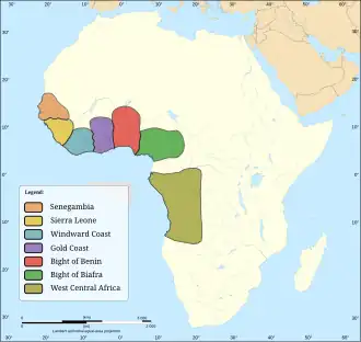 Até 1850, foi do Continente africano que veio o maior número de pessoas que entraram no Brasil.[42] Durante a época do comércio atlântico de escravos, o Brasil importou mais africanos escravizados do que qualquer outro país do mundo. Com base em informações do slavevoyages.org, 4.864.375 escravos da África desembarcaram no Brasil, entre o século XVI e a metade do século XIX, em torno de 40% dos escravos trazidos para as Américas. Os ancestrais africanos dos brasileiros foram trazidos principalmente da África Centro-Ocidental. Do total, 3 396 910 foram trazidos dessa área. A região costumava ser conhecida como Congo Angola, correspondendo aproximadamente aos territórios da atual Angola, República do Congo, República Democrática do Congo e Gabão.[43][44] A segunda região em importância foi o Golfo do Benim, de onde vieram 877 033 africanos. Essa região corresponde ao atual sudeste de Gana, Togo, Benim e sudoeste da Nigéria.[43][45]