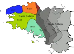 A Bretanha como entidade política desapareceu em 1790, quando foi dividida em cinco departamentos. Os départements (departamentos) bretões correspondem mais ou menos às nove dioceses católicas que surgiram no início da Idade Média. Eles eram frequentemente chamados de "pays" ou "bro" ("país" em francês e bretão, respectivamente) e também serviam como distritos fiscais e militares.[37] A Bretanha também é dividida entre a Baixa Bretanha ("Basse Bretagne" e "Breizh Izel"), que corresponde à metade ocidental, onde o bretão é tradicionalmente falado, e a Alta Bretanha ("Haute Bretagne" e "Breizh Uhel"), que corresponde à metade oriental, onde o galo é tradicionalmente falado. As dioceses bretãs históricas foram: