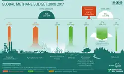 As emissões de metano provêm da pecuária, do estrume, do cultivo de arroz, dos aterros sanitários, das águas residuais e da mineração de carvão, bem como da extracção de petróleo e gás.[36] As emissões de óxido nitroso provêm em grande parte da decomposição microbiana de fertilizantes.[37]