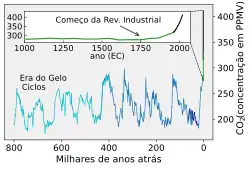 - ↑ Lüthi, Dieter; Le Floch, Martine; Bereiter, Bernhard; Blunier, Thomas; Barnola, Jean-Marc; Siegenthaler, Urs; Raynaud, Dominique; Jouzel, Jean; Fischer, Hubertus (Maio de 2005). «High-resolution carbon dioxide concentration record 650,000–800,000 years before present». Nature (em inglês). 453 (7193): 379–382. Bibcode:2008Natur.453..379L. ISSN 0028-0836. PMID 18480821. doi:10.1038/nature06949