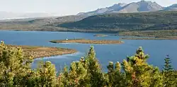 Lago Jack London em Kolyma, na Rússia com vegetação do tipo taiga em volta.