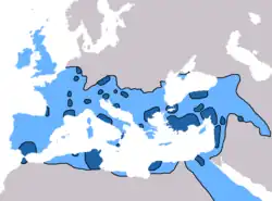 Difusão do cristianismo até 600 d.C. (em azul-escuro está a difusão do cristianismo primitivo até 325 d.C.)