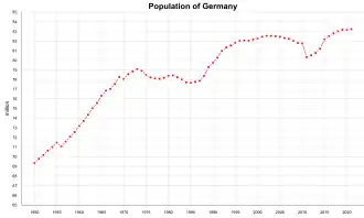 Com uma população de 84 milhões de pessoas (em 2022), cerca de 74% da população (um pouco mais de 60 milhões de pessoas) são considerados etnicamente alemães (com seus quatro avós nascidos na Alemanha).[14] A expectativa de vida é 80,19 anos (77,93 para homens e 82,58 para mulheres) e a taxa de fecundidade era, em 2011, perto de 1,41 filhos por mulher fértil, ou 8,33 nascimentos por 1000 habitantes, alguns dos índices mais baixos do mundo.[15] Contudo, a Alemanha vêm testemunhando um aumento no número de nascimentos, além da nova onda de imigrações que começaram na década de 2010,[16] que se diferenciava das outras ondas devido a entrada de pessoas com índices de educação superiores.[17][18]