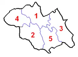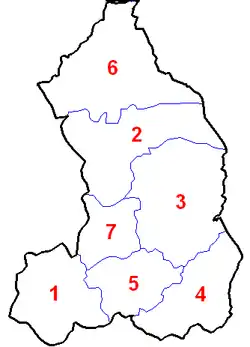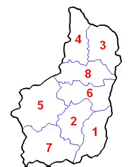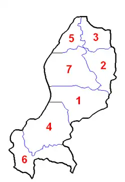 As províncias de Ruanda são subdivididas em 30 distritos (Kinyarwanda: uturere , sing. akarere ). Cada distrito é, por sua vez, dividido em setores, um total de 416 setores[ 1] [ 2]