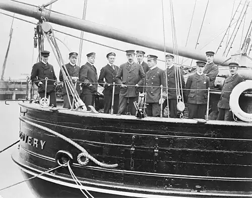 Como não fazia parte da Marinha Real, o Almirantado não permitiu que o Discovery usasse a bandeira branca da marinha. Acabou por navegar sob as leis da marinha mercante, usando as bandeiras da Royal Geographical Society e da Royal Harwich Yacht Club.[37]