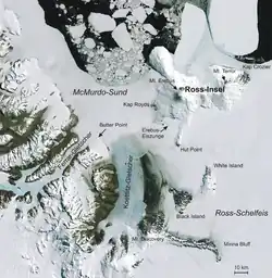 - ↑ Instruções do capitão Scott, líder da Expedição Discovery, determinavam "descobrir a terra que Ross acreditava existir, flanqueando a barreira para o leste".