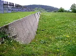 As barreiras antiveículos eram instaladas no outro lado da faixa de controlo primária. Em alguns locais, barricadas de cavalo de frisa (Panzersperre ou Stahligel, cavalos de aço) eram usadas para evitar o cruzamento da fronteira por veículos. Em todos os outros locais, valas antiveículo em forma de V (Kraftfahrzeug-Sperrgraben ou KFZ-Sperrgraben) estavam espalhadas por 829 km e só estavam ausentes em obstáculos naturais como rios, ribeirãos, ravinas ou densas florestas, que as tornavam desnecessárias.[62]