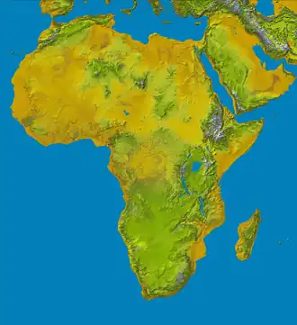O relevo africano se caracteriza pelo predomínio de imensos tabuleiros (planaltos pouco elevados) e considerável altitude média, de cerca de 750 metros. As regiões central e norte são ocupadas, em sua totalidade, por planaltos intensamente erodidos, constituídos de rochas muito antigas e limitados por grandes escarpamentos.