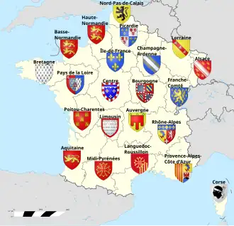- Metropolitana (o território na Europa, incluindo a ilha de Córsega): A França é dividida em 21 régions (regiões) e um território coletivo, Córsega. No entanto, Córsega é referida comumente como região no discurso comum. Estas regiões são subdivididas em 96 départements (departamentos), que são divididos em 329 arrondissements (distritos), que são divididas em 3 879 cantões, que são subdivididos em 36 568 comunas (a partir de 1/1/2004).