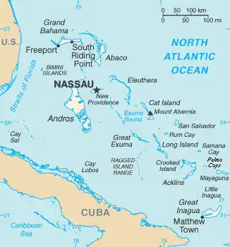 A maior ilha das Bahamas é a ilha de Andros, no ocidente do arquipélago. A ilha de New Providence, a leste de Andros, é onde se localiza a capital, Nassau, e onde mora cerca de dois terços de toda a população do país. Outras ilhas importantes são a Grande Bahama no norte e Inagua a sul.