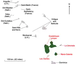 - a "ilha de Guadeloupe" (não confundir com a ilha mexicana de Guadalupe), que é na realidade composta por duas ilhas, ilha de Basse-Terre e Grande Terre, e ilhas próximas: